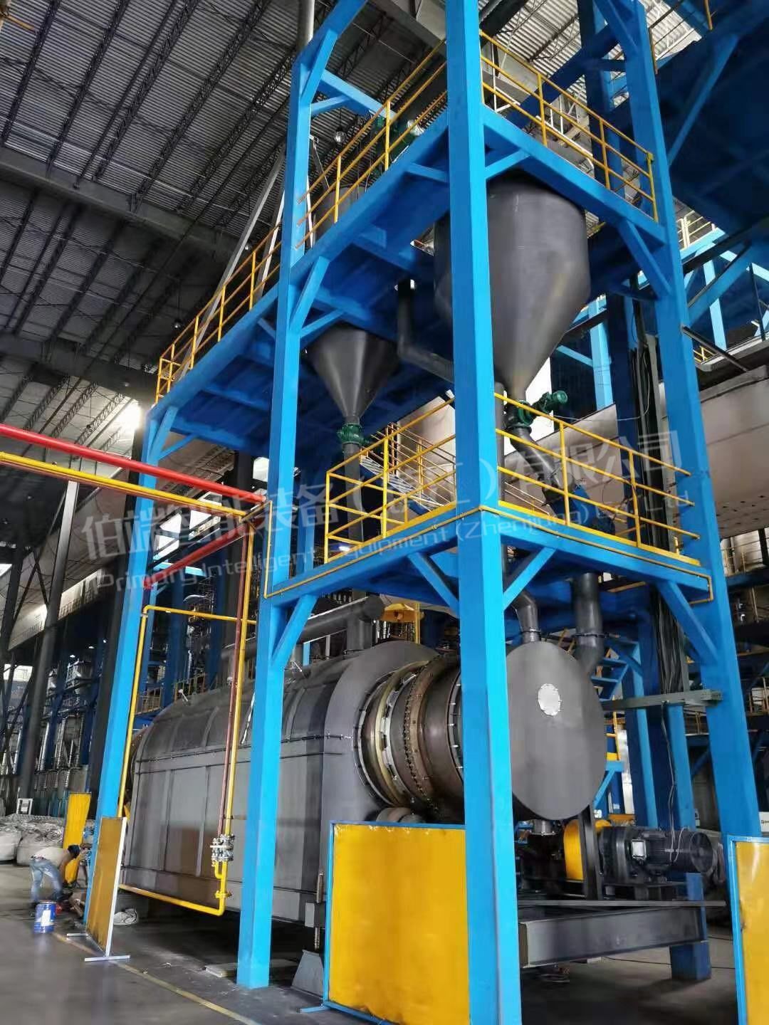 滚筒干燥窑主要由吨袋投料站,进料系统、回转干燥系统(保温炉衬、进出料箱、密封装置、传动机构、机架)热风加热系统、温度检测、布袋收料系统、破碎系统、螺杆水冷冷却机、电器控制等组成。